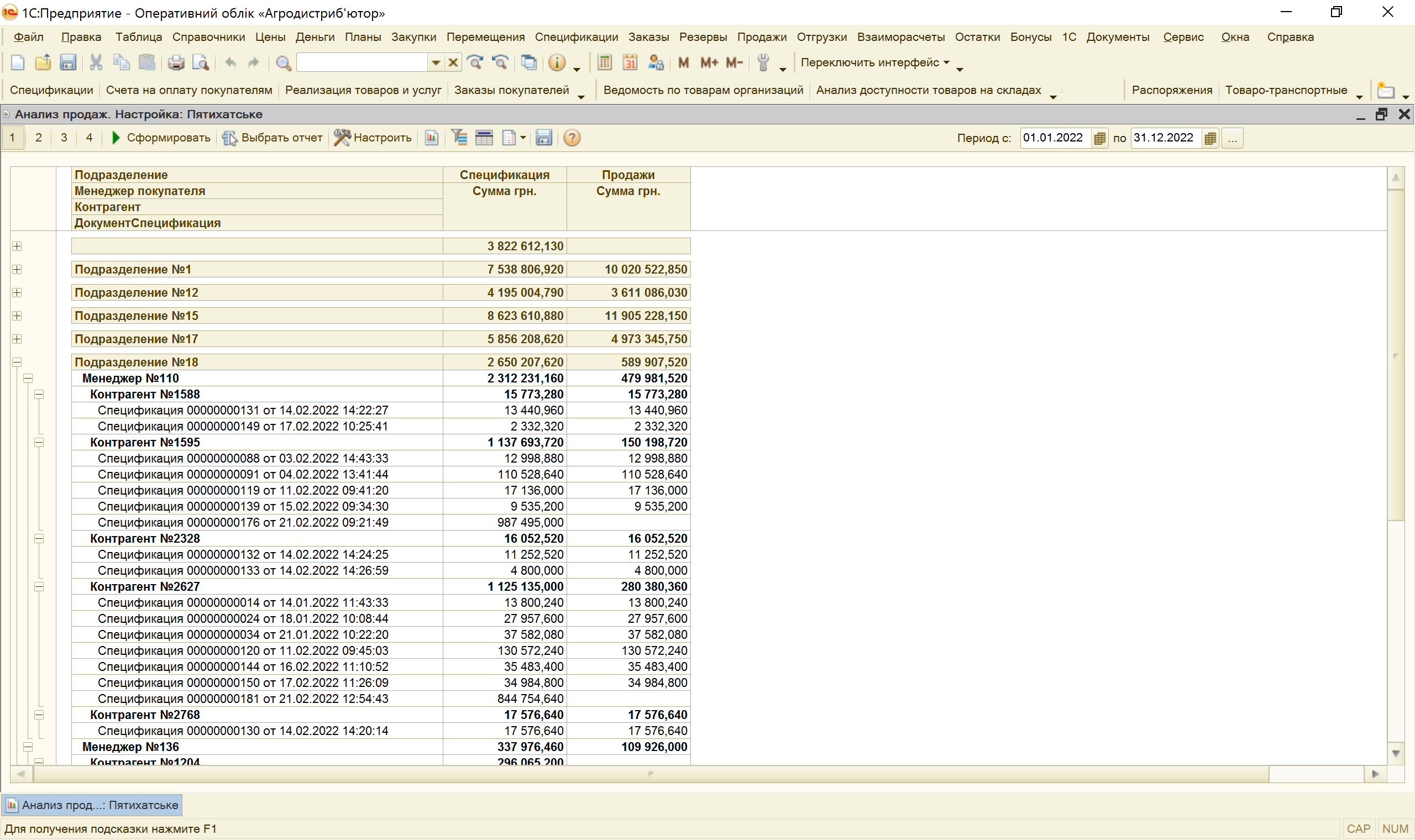 Аналіз продажів призначений для аналізу воронки продажів, наприклад Специфікації - Рахунки - Видаткові накладні.