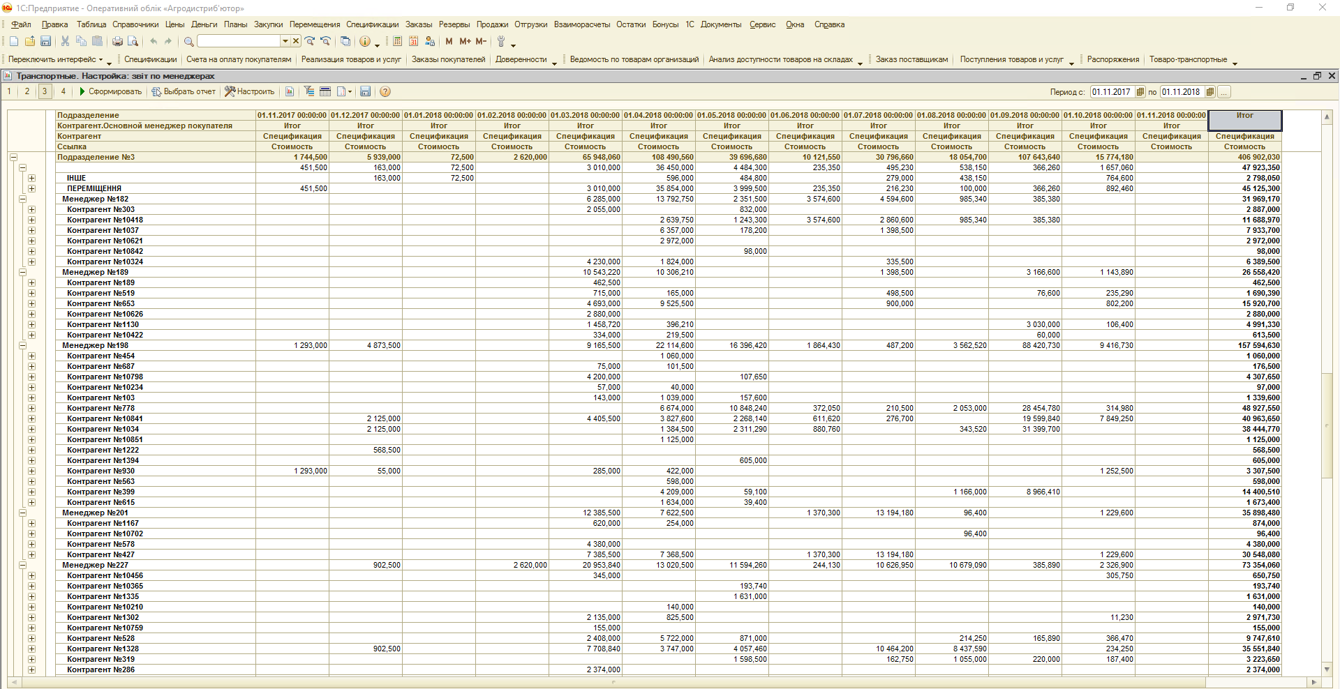 Звіт дозволяє формувати аналітику затрат за певний період по підрозділах, по контрагентах і т.д.